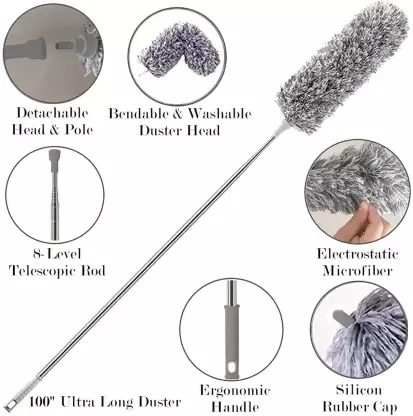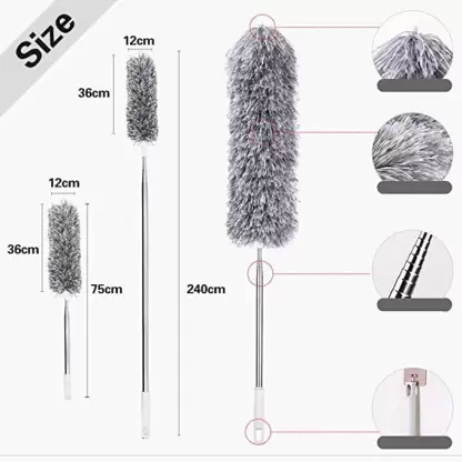 MICROFIBER & STAINLESS STEEL POLE: The fan duster is made of microfiber materials with extendable handle which does not rust and has a long life EXTRA LONG EXTENDABLE DUSTER: The microfiber duster with a extra long pole which can reach 100 inches when fully extendedBENDABLE & FLEXIABLE HEAD: The head of our long duster is flexible and bendable. You can bend the hand duster to any angles as you need. MULTI-USE FUNCTION DUSTER: We design the 360 dust for blind, ceiling fan, window, hanging light. It’s also great for photography, car, keyboard etc WHAT IS INCLUDED: We’re aiming to provide each customer with the highest standard of customer service. For any reason, our Microfiber Duster doesn’t satisfy you, simply contact us, We’ll try our best to solve problems for you. Buy with Confidence Duster Easy to Clean :- Want to clean the hypoallergenic duster? It couldn’t be simpler. Just slide the head off the telescopic wand, hand wash with warm or low heat water! Rotate the pole let the microfiber be fluffy. Place in ventilated place to dry. We’ve also designed the base of the extending rod with a hanging hole to make storage very space-friendly. EXTRA LONG EXTENDABLE DUSTER :- The microfiber duster with a extra long pole which can reach 100 inches when fully extended.